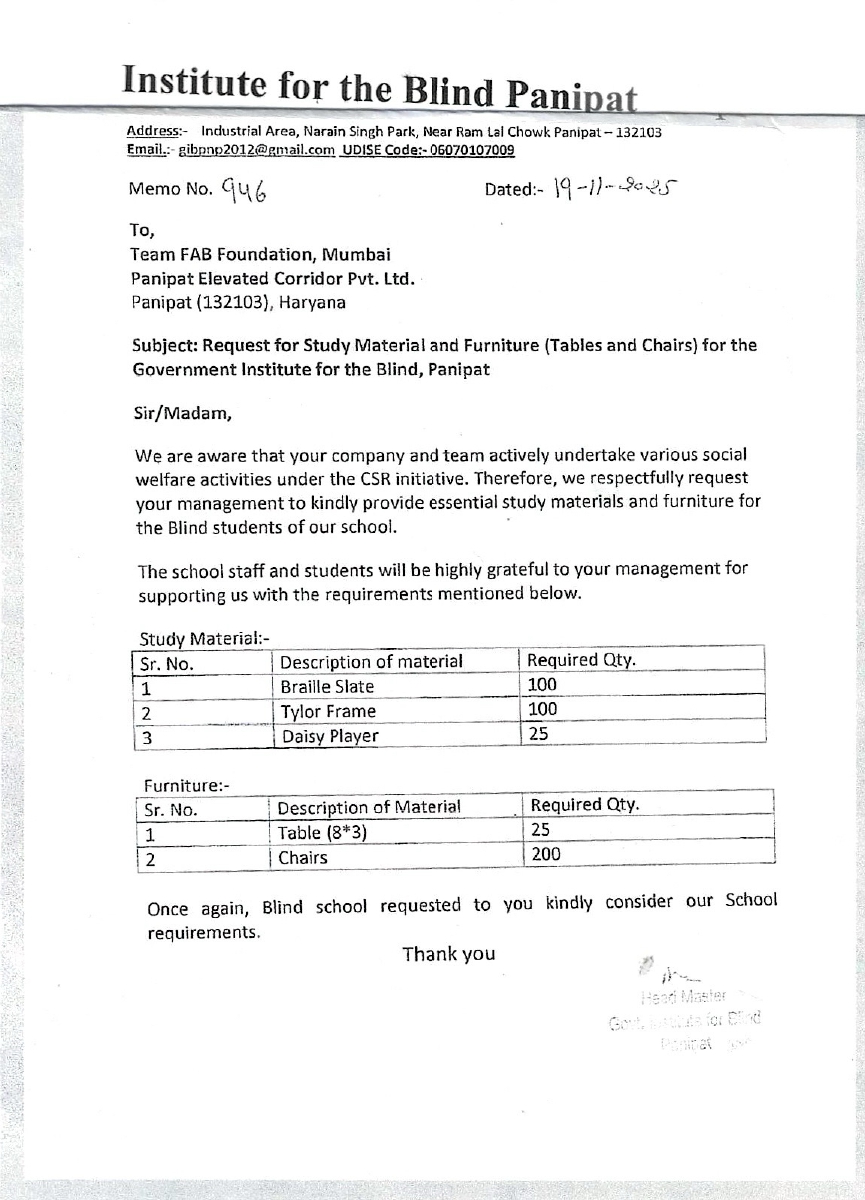 Privilege of supporting the Institute of Blind, Panipat – Feb 2026